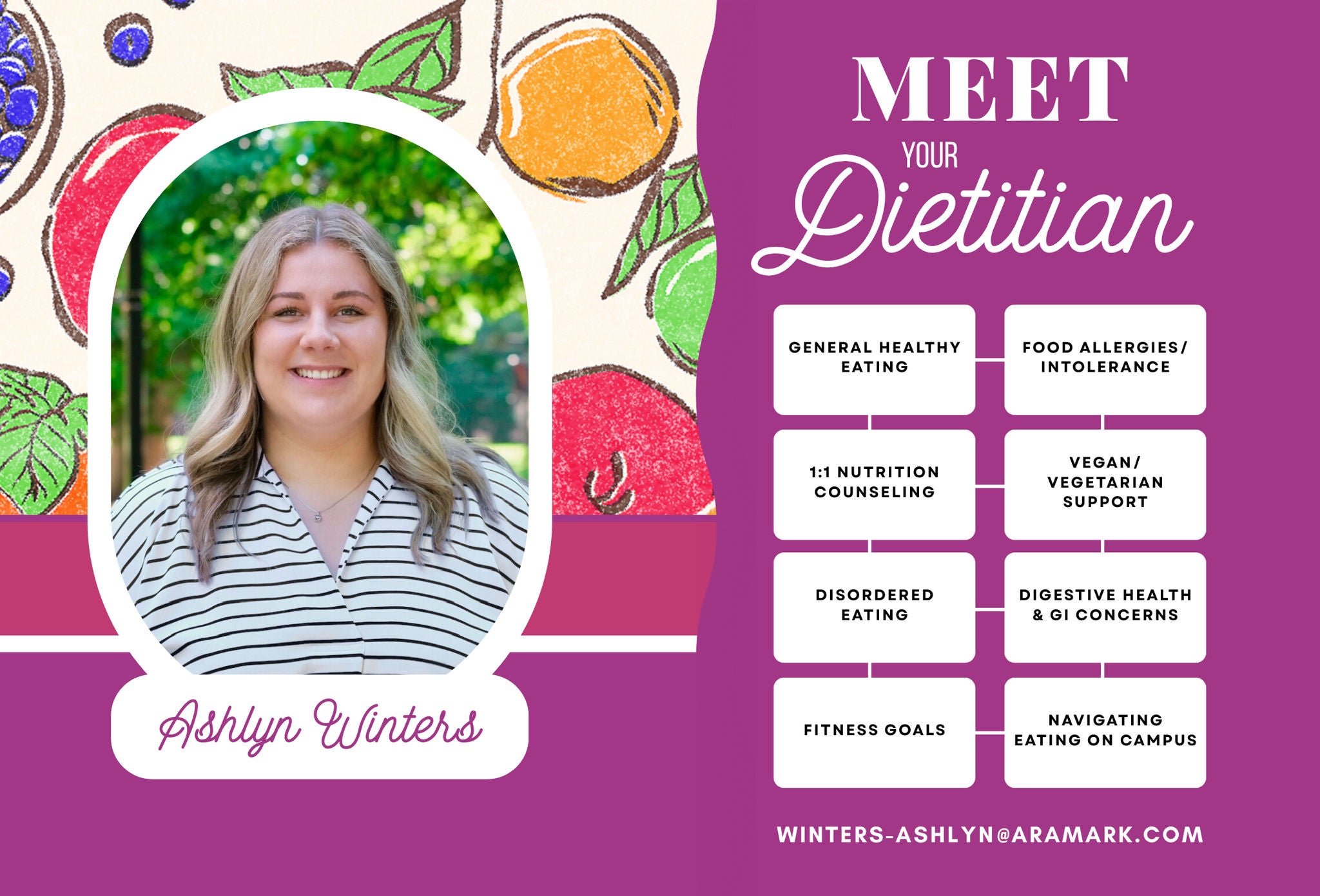 Ashlyn Winters is UofL Dining's Registered Dietitan. Ashlyn is a graduate of Illinois State University where she completed a Master's of Science in Dietetics. Ashlyn works with the culinary team to provide special dietary accommodations to students with food allergies and other dietary restrictions and holds events throughout the year to promote overall health and wellness. Ashlyn aims to help students gain a better understanding of their unique nutritional needs so that they feel empowered to make choices that best fit their goals.